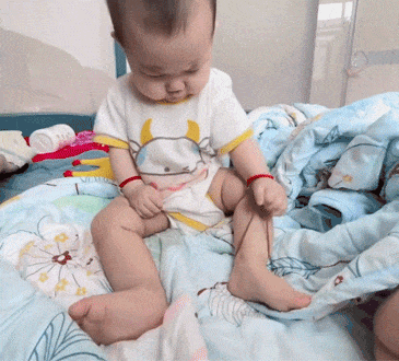 把皮筋套在脚上玩的小宝宝,成功把自己搞哭了