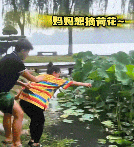 妈妈让儿子拽着衣服去摘荷花,结果脚下一滑,双双落…