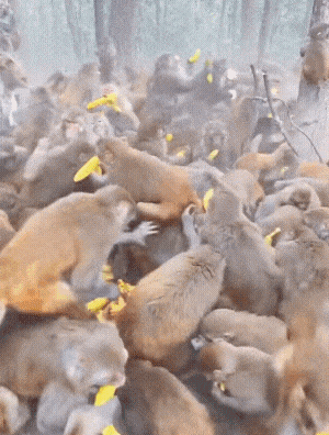 猴子争抢香蕉的画面堪比超市打折促销人挤人的场景,真是热闹非凡